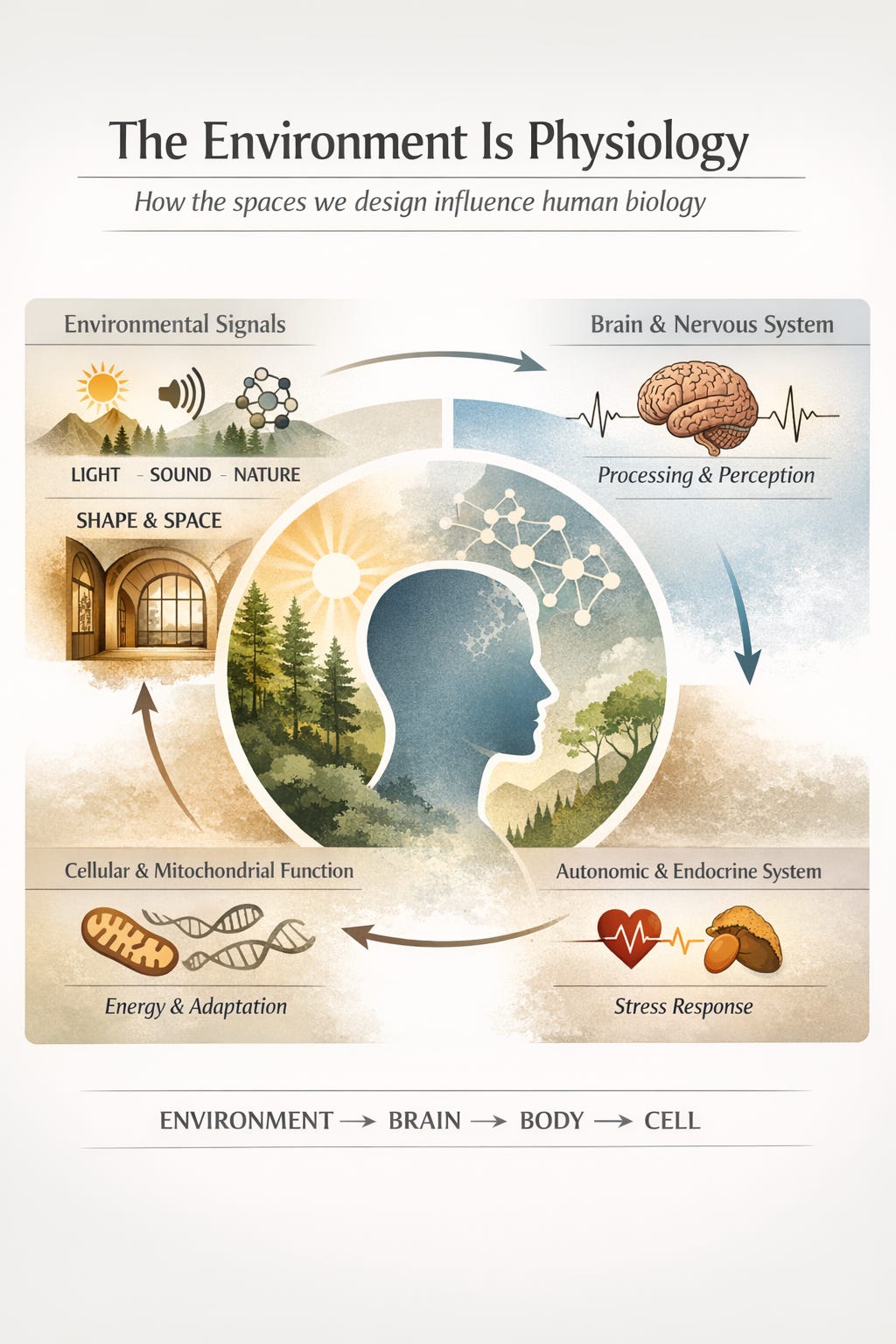 The body did not evolve in a sealed container. It evolved in continuous dialogue with its surroundings: light that varied by hour and season, soundscapes that carried information about proximity and safety, visual landscapes of organic complexity and fractal depth. The nervous system, the immune system, the mitochondria, these are not systems that merely tolerate the environment. They read it. Continuously. At a cellular level.